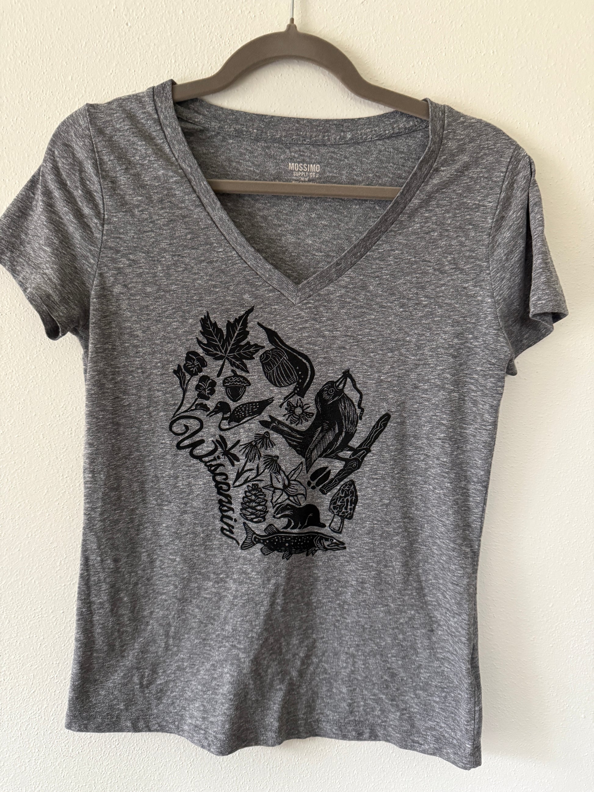 Hand stamped Wisconsin print on up cycled gray tshirt.